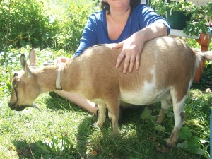 This picture isn’t worthy of Weathertop Farm Maia (full pedigree here), who is a stunningly beautiful doe whose babies are the best in our herd. Her 2009 daughter, Arava, daughter of Wiggy (Dawnland S Lord of the Dance) is our best first freshener ever and had the loveliest conformation on the farm. Maia gave us gorgeous twin does this year, Licorice and Marshmallow, as like as two peas in a pod and both with stunning conformation and the promise of great udders.